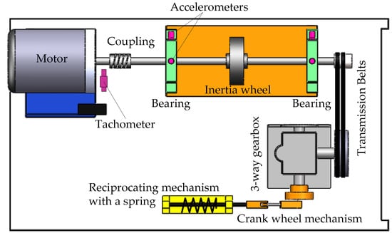 The test bench of the machinery fault simulation is shown in Figure 3. The bench mainly consists of a motor, a shaft supported by two bearings, an inertia wheel of , a belt transmission mechanism, a tree-way gearbox, a crank wheel mechanism and a reciprocating mechanism with a spring. The gravity force from the inertia wheel provides the radial load to excite high-frequency resonances of bearing fault. A varying elastic force is generated by the spring during the operation of the reciprocating mechanism. The varying elastic force provides a varying additional load to the motor and causes speed fluctuations. Meanwhile, the ratio of local radial load to axial load also changes with the varying elastic force and then causes roller slippages according to Reference [,]. However, the speed fluctuations can be tested with a tachometer while the roller slippages are unmeasurable.