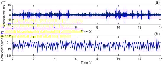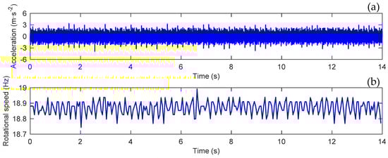 Healthy case: (a) raw vibration signals; (b) rotational speed.
