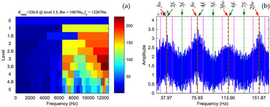 The Fast Kurtogram analysis result of the signal is shown in Figure 5a. An ‘optimal’ band of 11,733–12,800 Hz is selected. However, the signal in the band of the Fast Kurtogram can be affected by aliasing inevitably as the band is close to . Figure 5b shows the SES from the signal in the band of the Fast Kurtogram. It can be seen that the peaks at the spin frequency of , the fault frequency of and their harmonics are badly smeared, owing to aliasing, speed oscillations and possible roller slippages. Smeared fault frequency component and high background noise cause high ambiguity in detecting the fault.