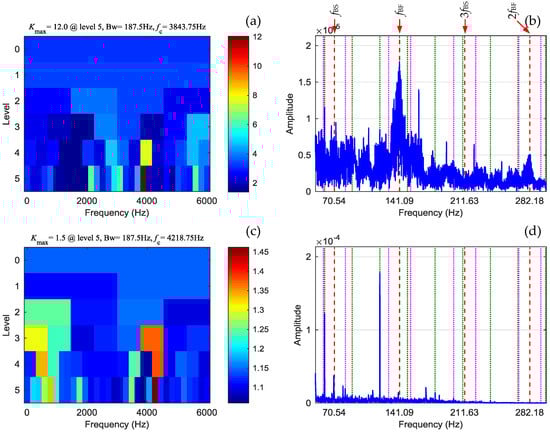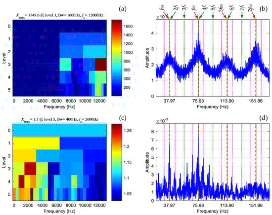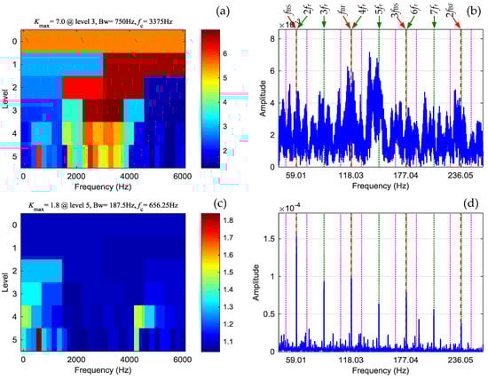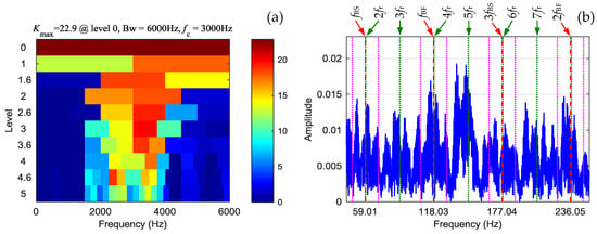 Figure 17a shows the analysis result of the Fast Kurtogram. A band of 5500–6000 Hz is selected and the band is close to . Figure 17b shows the SES yielded from this band, from which it can be seen that only the 1st order harmonic of the fault frequency is revealed, but the component still shows high smearing effects. The component of the spin frequency as well as the high order harmonics of the characteristic frequencies is submerged.