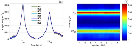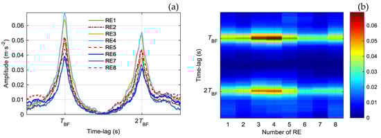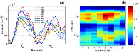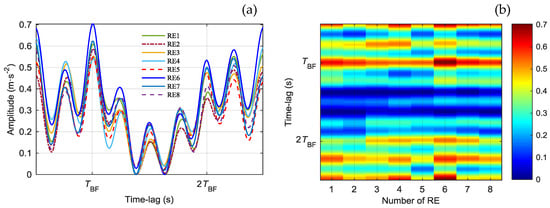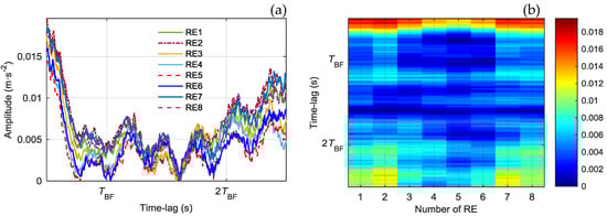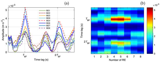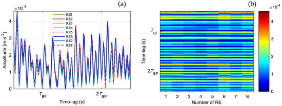 Figure 14 shows the LAIT-AEAs and their colour image yielded in this case. It can be seen that the LAIT-AEAs show clear peaks at the time-lags of and . Certainly, these two period components can also be deemed as the 4th and 8th order harmonics of the shaft frequency. However, a conclusion of roller defect can be drawn according to the colour image of the LAIT-AEAs as shown in Figure 14b. Particularly, the LAIT-AEA of RE 5 has the highest peak amplitudes, and the peak amplitudes decrease generally from RE 5 to the rollers further away in both clockwise and anticlockwise directions. These peaks together with their change features indicate that at least one of the rollers is defective and RE 5 is the most probably defective one.