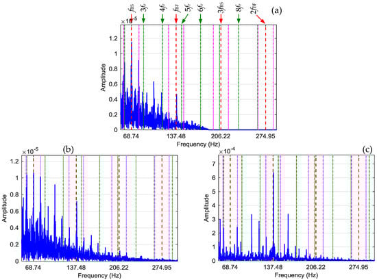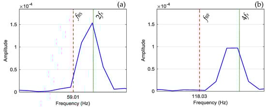 where denotes the nth order harmonic of the fault frequency, denotes the interfering harmonics excited by other rotating parts, denotes the background white noise. The nth order harmonic of the fault frequency can be presented as: