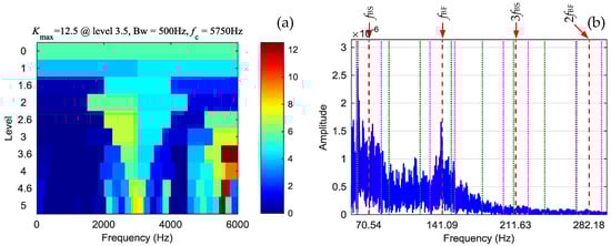 Figure 11 shows the Fast Kurtogram analysis result and the SES yielded from the Fast Kurtogram. It can be seen that the “optimal” band from the Fast Kurtogram is the whole band of 0–6000 Hz, which means that bandpass filtering does not have any effect at all. It can be seen from the SES that the component of the fault frequency and its harmonics are badly smeared and submerged in background noise and shaft components.