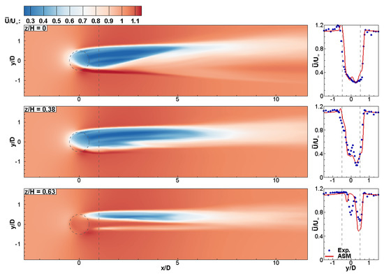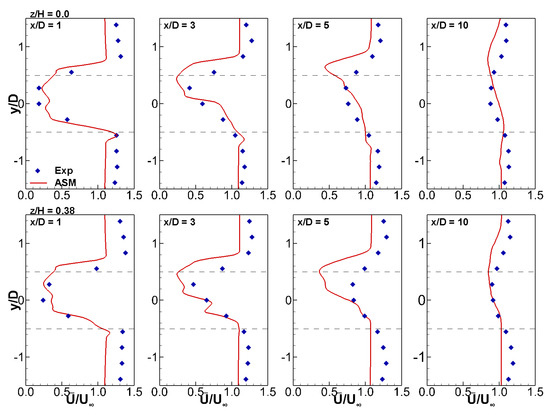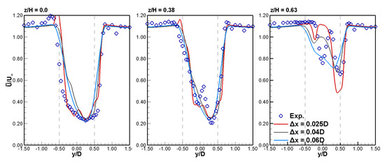 The results, in terms of the rotor’s wake, are provided at planes at three different vertical elevations of the domain: at the turbine mid-height, ; away from the centre-plane close to the top of the blades, ; and slightly above the turbine, . These elevations were selected from the available experimental data obtained from [5] in order to demonstrate a three-dimensional picture of the flow field generated by the ASM. First, a comparison of simulations employing different grid resolutions is presented in the discussion of Figure 3, Figure 4 and Figure 5; all subsequent results presented are those obtained using the finest grid resolution; i.e., D.