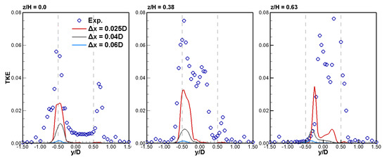 Profiles of turbulent kinetic energy (TKE) from simulations(solid lines) together with experimental data (scatter points) from [5] at (left), (middle) and (right), for three grid resolutions.