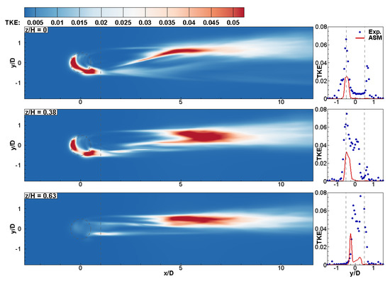 Left: Turbulent kinetic energy (TKE) contours; right: TKE profiles together with experimental data from [5] at =1. Elevations: (top), (middle) and (bottom).