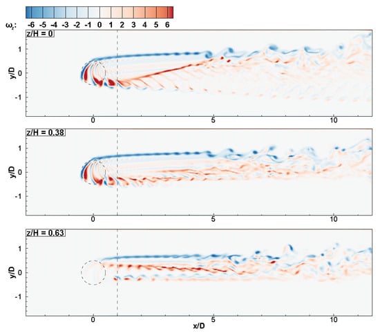 Contours of the vertical vorticity, , are presented in Figure 8. Blue and red contours, i.e., areas of high positive and negative vorticity, represent shed dynamic stall vortices and their interaction with the blades in the vicinity of the rotor. The motion of the turbine blades on the down-stroke generate the dynamic stall vortices, subsequently deflecting the wake towards the side, as previously mentioned, and demonstrated most clearly at . The vorticity induced by the vortex-blade interaction deflects in the opposite direction and diffuses laterally as the wake recovers. At the elevations and 0.38, on the side, a region of negative vorticity trailing from the location where the blade’s rotated angle, , corresponds to that of the missing peak in TKE values in Figure 7. These results correlate well with the fact that this wake region appears to be absent of vertical structures, which indicates the ASM is unable to represent the flow separation during the up-stroke motion of the blades. Above the turbine, at , the three-dimensionality of the wake is again demonstrated as the vorticity generated by the turbine expands in the vertical direction in the near-wake, increasing into the far-wake. Regularity of the vorticity is seen in the near-wake region, due to the periodic nature of the shedding and absence of ambient turbulence, then becoming increasingly irregular as it moves into the far-wake and transitions into turbulence at a distance of approximately , corresponding to regions of high TKE seen in Figure 7. In this region, the resultant increase in mixing recovers momentum from the unperturbed flow outside of the wake.