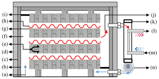 Schematic diagram of solid electric thermal storage (SETS). (a) Cold air. (b) Perlite. (c) Ceramic fiber. (d) Steel plates. (e) Thermocouple. (f) Flow channel. (g) Bricks. (h) Heating wires. (i) Partition wall. (j) Hot air. (k) Exchanger. (l) Supply water. (m) Return water. (n) Fan.