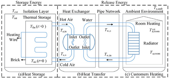 The structure of the temperature-based energy flow of the SETS. (a) Heat storage. Electric energy is consumed by the heating wires and stored in the thermal brick in the form of thermal energy. (b) Heat transfer. The stored thermal energy is transferred to the circulating water through the heat exchanger. (c) Customers heating. Uses the thermal energy to keep the room warm.