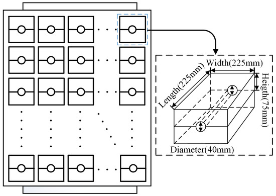 where is the surface heat transfer coefficient of the bricks, is the surface area of the round holes in the bricks as shown in Figure 3. Many bricks are superimposed to form the core frame of the thermal storage. Two heat bricks are stacked together to form a circular hole in the center of the bricks as shown in the zoom figure. Electric heating wires are placed in the middle of the hole. L, W, H, and D are the length, width, height, and diameter of the brick, respectively. is the area of hot airflow channel which is stacked by two bricks together, , where N is the number of bricks in a row. Based on the Nusselt–Number , the heat transfer coefficient can be calculated by the Zukauskas formula [24]. is the thermal conductivity.