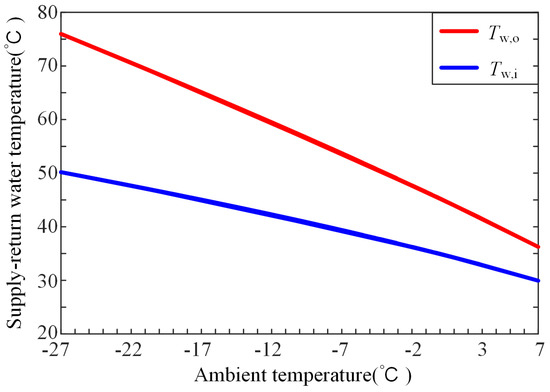 The overshoot of water temperature and the frequent start of the fan are easily caused by the use of and owing to the inertia of temperature change. Therefore, in this paper, the highest supply water temperature and lowest return water temperature during the heating period are designed. Taking Shenyang city as an example, the minimum and maximum temperatures of are taken into Equation (12) to obtain the temperature curves of supply and return water as shown in Figure 4. The minimum temperature of return water is selected as the benchmark so that the change of temperature can be deduced as shown in Equation (13).