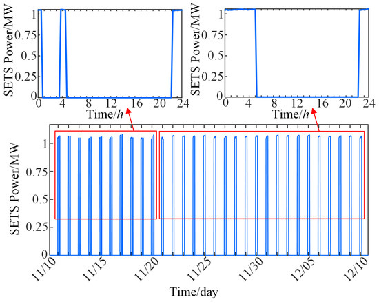 The working time t of the SETS is determined by the different electricity consumption behavior characteristics of customers. For example, two types of behavior characteristics of SETS customer within one month is shown in Figure 5. One type starts from the previous night 22:00 and stops heating at 1:00. Then, SETS starts again at 3:00 and ends the reservoir at 5:00. The other type starts from the previous night 22:00 and then continues to work until the end at 5:00. The consumption time t of one type is on the left curve, and the other type is on the right curve.