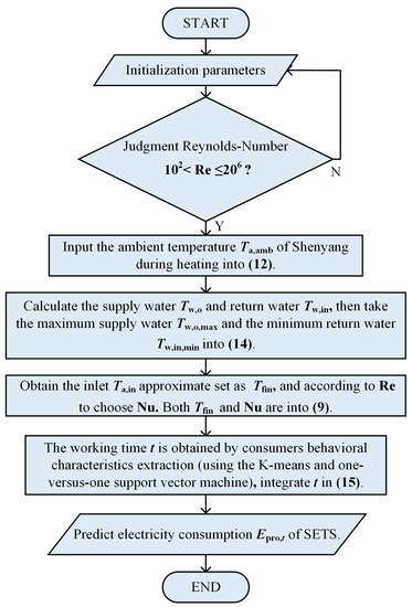 Based on the above analysis, the proposed PM of SETS can be used to predict the daily electricity consumption. The overall PM flowchart is shown in Figure 6. According to the initial values, the range of Reynolds-Number () is estimated. If or , return the initialization parameters, otherwise, input the ambient temperature to obtain temperatures of and . Select the maximum value of supply water and the minimum value of return water . Then, obtain the inlet temperature . is selected based on the range of , so input the and to predict the average power consumption . The is integrated over working hours t. According to the stored thermal energy in the bricks, the predicted value of SETS heating wires electricity consumption can be obtained.