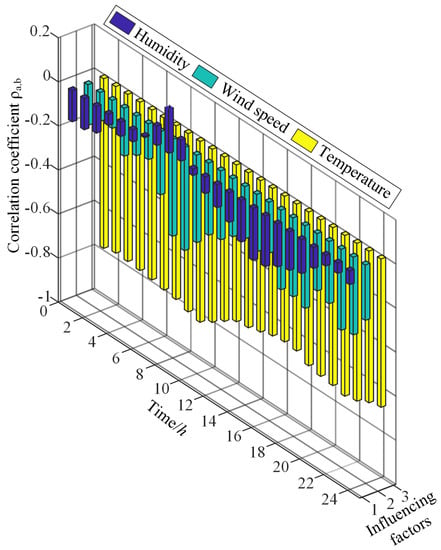 The statistics on the correlation between the influencing factors and SETS load within 24 h is as shown in Figure 7. The histogram explains which influencing factors are strongly correlated with the SETS load. The influencing factors (including humidity, wind speed, and temperature) are negatively correlated with the load, and humidity is positively correlated with the SETS load only in the range of 8:00 to 10:00. The ranges of correlation coefficient of humidity (blue), wind speed (green) and temperature (yellow) are , , and , respectively. It can be seen that the correlation between the temperature and SETS load is strongly negative, while humidity and wind speed are weakly correlated with SETS load. Thus, the temperature is selected as the input of the cyber and PMs.
