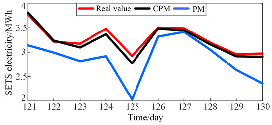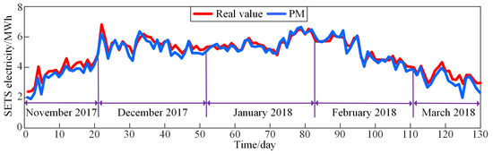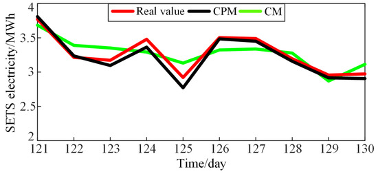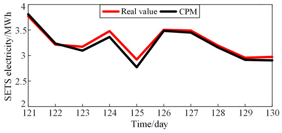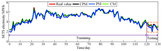 The load data of 1MW SETS during the heating period from 10 November 2017, to 19 March 2018, are taken. The PM parameters of SETS are selected as shown in Table 2. The data of 120 days are used as the training set, and the data of the later 10 days are used for the testing. The simulation results are shown in Figure 11. The four curves are the individual SETS real values, CPM, PM, and the CM predicted value. The trained model is used to test the load condition in the following 10 days. From the training results, the CPM predicted value coincides with the real value. In the testing results, the comparison data in the orange dotted frame is enlarged for 121–130 days as seen in Figure 12, Figure 13 and Figure 14. The result after the application of the CPM is significantly better than that individually predicted by the PM and CM alone.