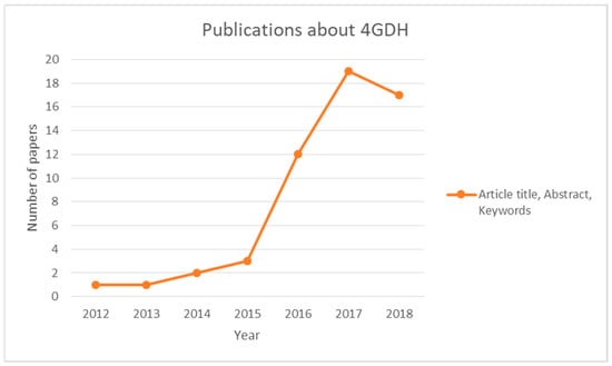 The number of publications between 2012 and 2018 that include the term 4th generation district heating in their article title, abstract, or keywords according to the literature database Scopus. A significant increase in such publications can be observed between 2015 and 2017.