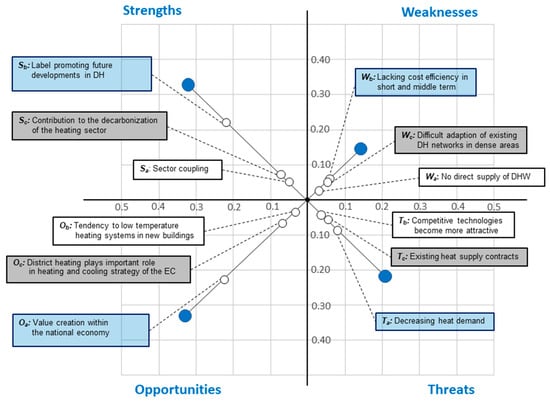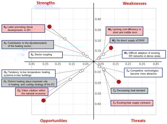 Figure 2 and Figure 3 illustrate the results graphically. Each graph is divided into four sections, one for each SWOT field, following the conventional logic strengths—weaknesses—opportunities—threats. The individual factors are named and indicated by a transparent circle. With a higher distance from the origin (0; 0), the importance of the individual factor increases. The different SWOT fields are illustrated with red or blue circles and a line marking their distance from the origin. The longer the line (i.e., the higher the distance from the origin), the greater the importance of the respective SWOT field.