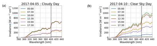 (a) Spectral irradiance from 280 nm to 440 nm under a day of cloudy sky conditions. (b) Spectral irradiance from 280 nm to 440 nm under a day of clear sky conditions.