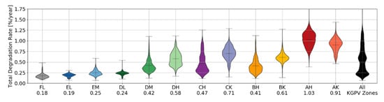 The total degradation rates calculated by the combination of the previous three degradation mechanisms Equation (13) are also evaluated per each KGPV climate zone. In accordance with the literature [6], the highest degradation rate is identified in tropical areas (hot and humid). Interestingly, the AK (tropical with very high irradiation) presents lower degradation than the AH (tropical with high irradiation), due to lower photo-degradation contribution (related to lower humidity).