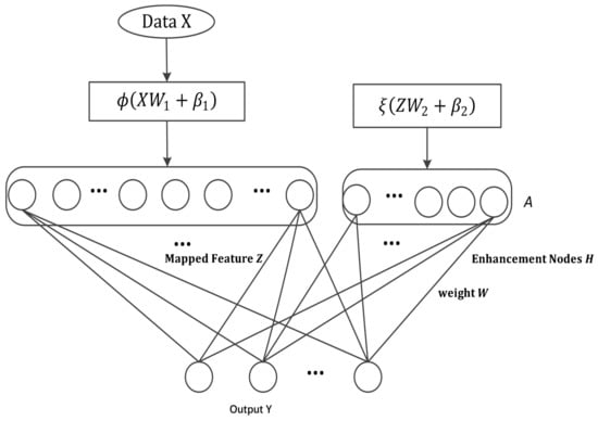 A broad learning system (BLS) is a kind of planar neural network, developed from a function chain neural network [], which is composed of an input layer, an intermediate layer, and an output layer, as shown in Figure 3. The middle layer consists of two kinds of neurons with different properties: feature neurons and enhancement neurons. The function of a feature neuron is to conduct the feature extraction of data by the feature extraction function . The data X of the input layer is transformed, by the feature neuron, to Z under the action of the function, following which Z generates an enhanced node H by the function . Together, feature neurons and enhancement neurons form the middle layer .