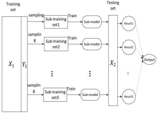 - Data preparationThe whole dataset is divided into a training dataset (of size ) and a test dataset (of size ). Setting the sampling ratio p, (where [x] denotes the largest integer no more than x) samples are chosen from the training dataset using the bagging sampling method. This sampling process is then repeated T times. As a result, T different subtraining datasets are prepared for submodels. The T sub-datasets are, then, , where the whole feature part is written as and the label part is . Furthermore, the test dataset can be represented by .