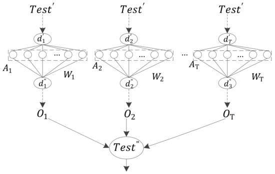 - Test the ensemble modelWhen testing the sub-BLS models, is used as an input for each model, obtaining T outputs for each submodel through Equation (9):Then, the output of the bagging-BLS model can be computed by Equation (10):