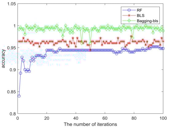 In order to test the advisability of the application of the proposed model for the wear fault diagnosis of aircraft engines, we used the random forest (RF) algorithm for comparison, in order to illustrate the desirability and superiority of the bagging-BLS algorithm. Random forest is a classical ensemble learning algorithm [], where decision trees are used as sublearners to obtain better accuracy (over a single decision tree). The trees in RF used the C4.5 algorithm and the depth was 12, including a total of 100 trees in the forest. There were 500 training data samples and 250 test data samples. In the following experiments, random forest is denoted as RF, broad learning system is denoted as BLS, and the proposed model is denoted as bagging-BLS.