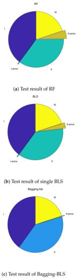 Figure 9 shows the testing results of the three algorithms in the form of a pie chart. There were three types of wear models, represented by different colors. The offset slices in the pie represent the error cases, titled by the corresponding class name; for example, II-error means an error case in category II. The slices that are not offset represent correctly predicted cases. The offset area can be seen to decrease from Figure 9a–c, indicating that the accuracy of the testing result is highest for the bagging-BLS model.