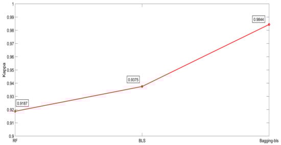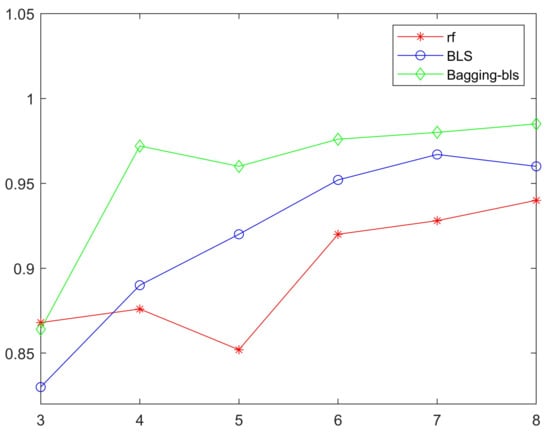 Figure 11 shows the performance of the algorithms under different numbers of inputs (from 3–8). The horizontal axis represents the number of inputs and the vertical co-ordinate represents the test accuracy. It can be seen that, when only three features were input into every model, random forest and bagging-BLS had the same performance (at 0.86) and single BLS performed badly. However, when an increased number of features were input, both the bagging-BLS and single BLS models improved quickly, but the performance of random forest decreased before improving. As is shown in the figure, the performance of bagging-BLS was better than the other models for all numbers of input features. The results show that bagging-BLS obtained the best diagnosis accuracy under different inputs.