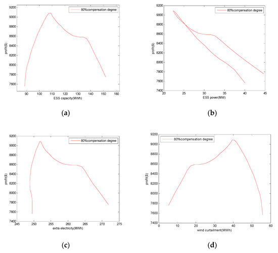 Taking 80% compensation degree as an example, when the ESS unit power cost was 382.1 × 10,000 $/MW, the max profit was zero, meaning that above 382.1 × 10,000 $/MW, there would be no need to invest in ESS. For other compensation degrees, the critical ESS unit power cost also could be calculated.