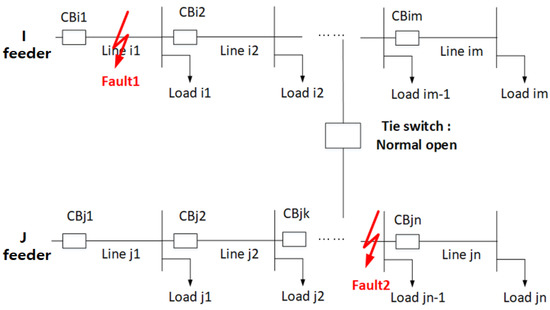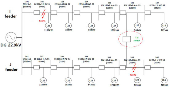 Figure 1 shows the loop MG model, where the tie switch is typically open. The tie switch is typically open at normal states; therefore, it is a separate radial system in which the I and J feeders are separated. However, when a fault occurs, problems not considered in a radial system must be addressed.