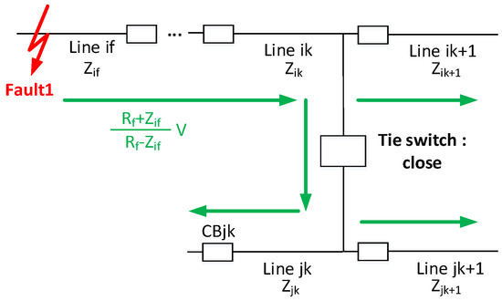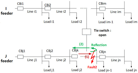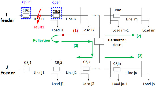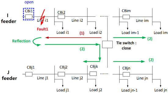 In a failed fault Section separation, a traveling wave occurs at the point where the tie switch is closed, as describe in Section 3.1. The traveling wave propagates along the I feeder and the reflected wave is generated at the fault point ((1) in Figure 4). The magnitude of the reflected wave is given by Equation (2).