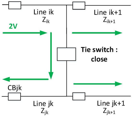 In Figure 3, the magnitude of the voltage that is refracted at the point where the tie switch is connected is presented in Equation (1).