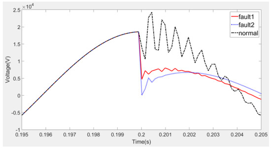 Figure 8 shows the enlarged voltage waveforms measured at the front of the 206 Section, which is the tie switch connection point in the J feeder for each case. In Figure 8, “fault1” implies the case of fault current injection from the J feeder by an unsuccessful fault Section separation. Furthermore, “fault2” implies the fault at fault2 in the J feeder; “normal” implies the case of a normal load current supply from the J feeder by a successful fault Section separation. In the “normal” waveform, the duration of the switching surge is the longest, as analyzed in Section 3. The magnitude of the switching surge is the smallest in “fault 1.” Because the fault resistance is 1 Ω, “fault1” and “fault2” should be compared with each other considering Equations (3) and (4) with negative values. The WT is performed using the original voltage waveform to obtain the new index value of Equation (8).