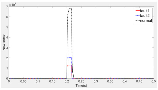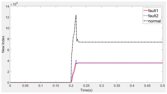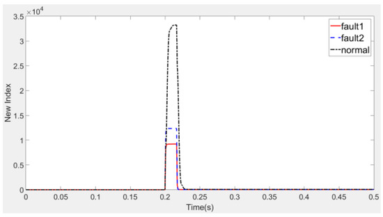 The results of Haar, db4, and sym5, which are the most typically used MWs for power system signal analysis, are compared. Figure 9, Figure 10 and Figure 11 show the calculation result of the new index using Haar, db4, and sym5, respectively. We compare the maximum value and the time required to reach the maximum value. The comparison results are shown in Table 1. In Table 1, time implies the time taken to reach the maximum value, and “fault1,” “fault2,” and “normal” are the same as those in Figure 8. From Table 1, the Haar MW exhibits the largest difference for each case among the three MWs, but requires the longest time to reach the maximum value. Therefore, the Haar MW is excluded. If we examine Db4 and sym5, it is apparent that the difference between the maximum values at each case is greater than 3000. In our comparison, the time required to reach the maximum value is highly similar; however, db4 is faster than sym 5 in the case of fault1. Therefore, we selected db4 as the MW in this study.