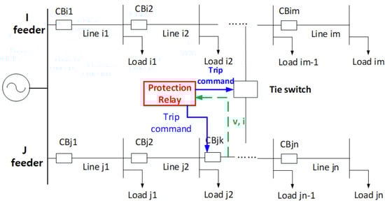 Herein, we propose a new protection scheme based on the cooperation with a tie switch to solve the problem analyzed in Section 2. The system configuration for the proposed protection scheme is shown in Figure 12. In the conventional distribution system, over current relay (OCR) is used; therefore, only current is used to detect a fault occurrence. However, the proposed protection scheme receives voltages and currents as inputs. The protective relay subsequently issues a trip command to the tie switch and circuit breaker (CB).