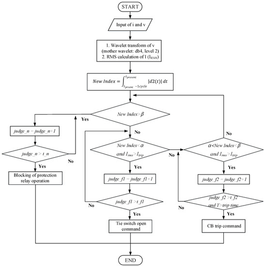 Figure 13 shows the flowchart of the new protection scheme. First, the voltage and current are input to the protection relay, and WT is performed using the voltage, and the root mean square (rms) value of the current is calculated. The mother wavelet (MW) in the WT is the db4 determined in Section 4.2. Next, the proposed scheme calculates the new index proposed in Section 4.1.