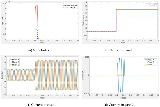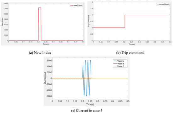 Figure 16 shows the simulation results of case 5. As shown in Figure 16a, the new index value after the fault occurrence indicates the intermediate value between α and β as 12,300. As shown in Figure 16c, the fault current is 2.6 times higher than the normal current. Therefore, as shown in Figure 16b, the circuit breaker open command is issued at 0.205 s. As shown in Figure 16c, the current is cut off after 0.255 s after the completion of the circuit breaker operation.