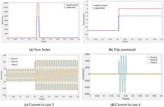 Figure 15 shows the results of cases 3 and 4. In this case, the fault point is closer to the tie switch than in cases 1 and 2. As shown in Figure 15a, after the tie switch is closed at 0.2 s, the new index in case 3 is increased above the setting value β, while that in case 4 is not increased above the setting value α. Therefore, as shown in Figure 15b, a blocking command in case 3 is issued in 0.2086 s and a tie switch open command in case 4 is issued in 0.2056 s. As shown in Figure 15c, the 47 [A] before the tie switch close is increased 2.4 times to 113 [A] after the tie switch closes. In the conventional OCR, the instantaneous trip condition is satisfied. However, according to the protection scheme proposed herein, because the protection relay outputs a blocking signal, the normal load current is therefore supplied continuously. In Figure 15d, the fault current is injected after the tie switch is closed, and the fault current is much larger than the normal load current. Therefore, according to the protection scheme, the protection relay issues a tie switch open command, and the tie switch is completely closed at 0.2556 s considering the operation time. Therefore, thereafter, a normal load current flows again.