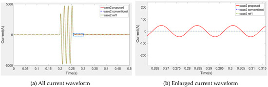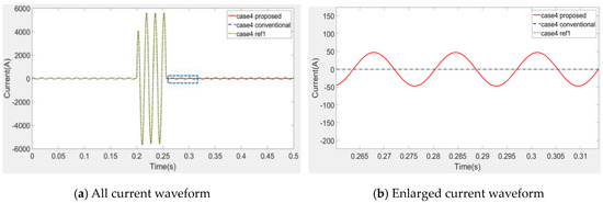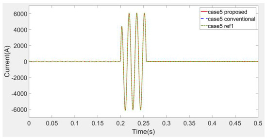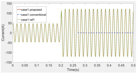 To prove the superiority of the proposed protection scheme, we compare the results using the protection method in previous studies. In each figure, “proposed” implies the result of applying the proposed protection scheme, “conventional” implies the result of applying the conventional OCR, and “ref1” implies the result of applying the algorithm in reference [1]. Here, only the current at phase A is compared.
