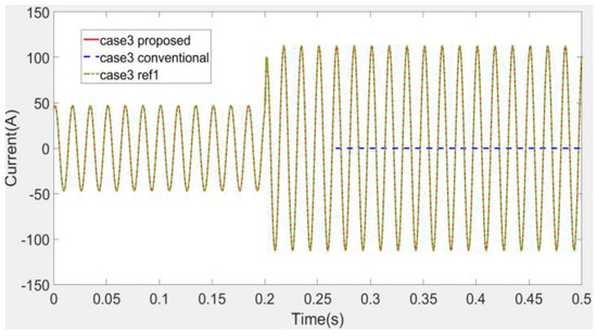 Figure 17 shows the comparison result of case 1. Before 0.256 s, the results of the proposed scheme and those of previous studies are the same. However, when conventional OCR is applied, it is recognized as a fault because the current exceeds 2.5 times the normal current and the CB is opened. That is, when conventional OCR is applied, the load experiences an outage. However, in the case of the proposed scheme and ref1, the normal current flows because the operation of the protection relay is blocked.