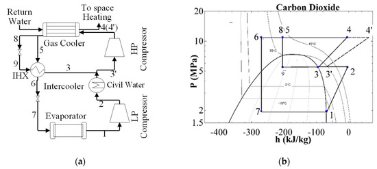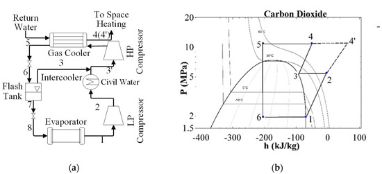 Increased concern for the world energy crisis and environmental problems has led to greater interest in eco-friendly refrigerants that are suitable for high-efficiency heat pump applications. Due to the abolition of chlorofluorocarbons (CFCs) and hydrochlorofluorocarbons (HCFCs) in the Montreal Protocol and the regulation of Hydrofluorocarbon (HFCs) in the Kyoto Protocol, the “natural” refrigerants have attracted considerable attention. Among the existing natural refrigerants, carbon dioxide (CO2) is considered especially attractive because it is nonflammable, nontoxic, free from mutagens and carcinogens, and very low in cost [1]. However, the major disadvantage of the CO2 cycle that influences its acceptance in the market is its lower performance [2,3,4].