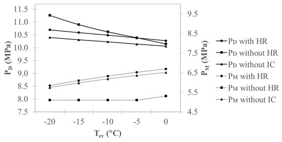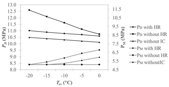 Figure 4 shows the variation of the optimum PD and PM for each sub-cycle with the change of Tev from −20 °C to 0 °C for the intercooler cycle. It was found that for the sub-cycle without heat recovery, the optimum PM was calculated to have an optimum value of 5.1 MPa for all operating conditions. This means the that sub-cycle without heat recovery had a maximum COP when PM was operating at its minimum limit. The sub-cycle without intercooling had an optimum PM of 5.1 MPa when the Tev was less than −15 °C. It was also observed that the optimum PD of each sub-cycle decreased linearly with Tev. For the sub-cycle with heat recovery, the optimal PD decreased linearly with Tev, while PM increased with Tev.