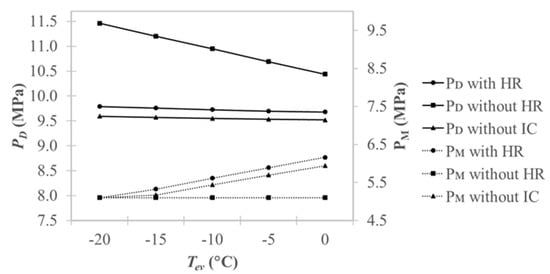 Figure 6 shows the variation of the optimum PD and PM for each sub-cycle with the change of Tev from −20 °C to 0 °C for the split cycle. It can be observed that, regarding the optimal PM of the sub-cycle without heat recovery, the split cycle resembled the other two cycles investigated above. The sub-cycle without heat recovery had an optimum PM of 5.1 MPa until Tev was around −5 °C. Like the flash cycle, the optimum PD decreased almost linearly with the increase of the Tev for all the sub-cycles and the PM increased with the increase of the Tev for the sub-cycle with heat recovery and the sub-cycle without intercooling. This might be because the sub-cycle without heat recovery had the maximum COP at the lower bound of the PM when the Tev was less than −5 °C. Therefore, the PD without HR was larger than the PD with HR when the Tev was less than −5 °C and lower than the PD with HR when Tev was 0 °C and −5 °C.