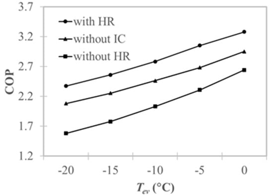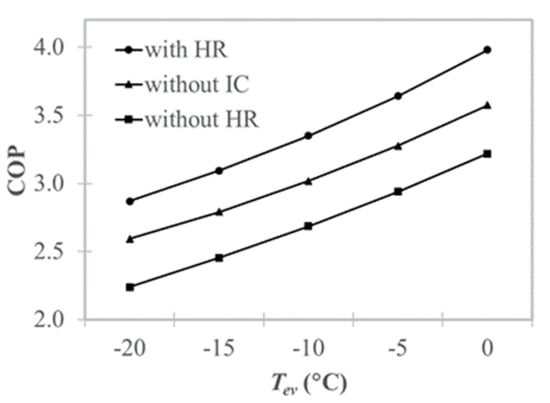 In terms of the COP comparison of the sub-cycle without intercooling and the sub-cycle without heat recovery, the heating capacity of the sub-cycle without intercooling was greater than that of the sub-cycle without heat recovery by 34.4% to 17.9% when Tev increased. The compression work of the sub-cycle without intercooling was more than that of the sub-cycle without heat recovery by 11.3% to 8.7% as Tev increased. Obviously, the greater heating capacity of the sub-cycle without intercooling was a more significant factor that its better performance. Hence, the sub-cycle without intercooling yielded a higher COP than the sub-cycle without heat recovery.