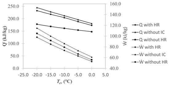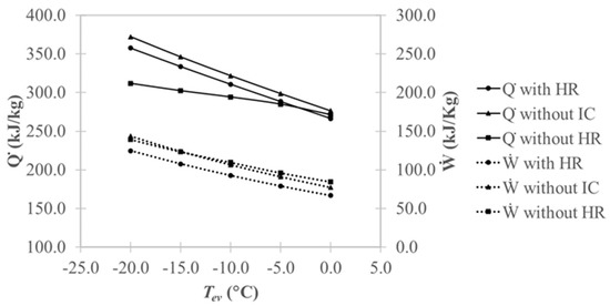 Figure 12 illustrates the heating capacity and compression work comparison at optimal conditions for the split cycle. The results may be due to the sub-cycle without heat recovery having an optimum PM at the lower bound until Tev was around −5 °C. Consequently, the heating capacity slope of the sub-cycle without HR changed at around −5 °C. This led to the heating capacity of the sub-cycle without HR being greater than the sub-cycle with HR when Tev was more than −5 °C.