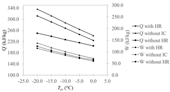 It can be observed that both the heating capacity and compression work of the sub-cycle without intercooling were greater than those of the sub-cycle with heat recovery. Although both the heating capacity and work values of the sub-cycle without intercooler were greater than those of the sub-cycle with heat recovery, the higher COP of the sub-cycle with heat recovery was attributed to the compression work having a more significant influence on COP than heating capacity. For example, when Tev = −20 °C, the heating capacity of the sub-cycle without intercooling was greater than that of the sub-cycle with heat recovery by 5.3%. Meanwhile, the compression work of the sub-cycle without intercooling was greater than that of the sub-cycle with heat recovery by 17.3%. As a result, the sub-cycle with heat recovery outperformed the sub-cycle without intercooling.