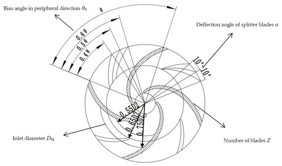 The inlet diameter of splitter blades is related to the action length of splitter blades. Theoretically, the longer the splitter blades, the larger the head, so the inlet diameter Dsi of splitter blades was selected as the third factor of the orthogonal test. The deflection angle of splitter blades α affects the velocity distribution of the impeller outlet, which has a significant influence on the performance of the magnetic drive pump. The deflection angle of splitter blades was selected as the fourth factor of the orthogonal test. Four selected factors of the orthogonal test are presented in Figure 1.