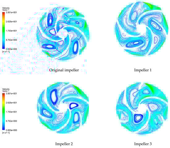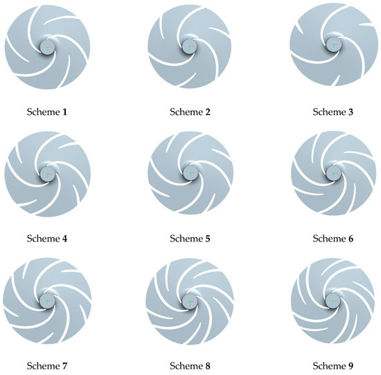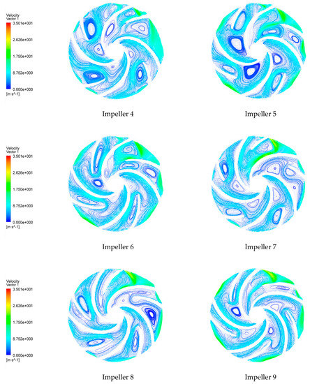 The internal flow condition of the impeller reflects the advantages and disadvantages of the hydraulic design. The nine impeller schemes were numerically simulated, respectively, and the internal flow cloud diagram of the impellers at design flow rate condition are shown in Figure 9.
