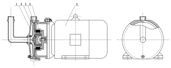 Figure 3. Configuration of the magnetic drive pump. 1—pump shell; 2—impeller; 3—isolation sleeve; 4—external magnetic rotor; 5—motor.